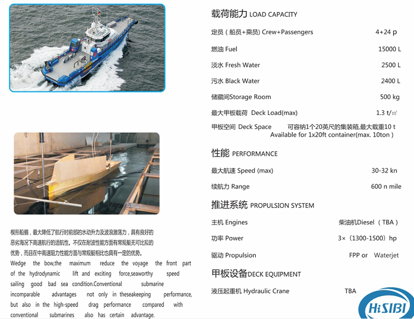 | 船體材料: | 玻璃鋼 | 發(fā)動(dòng)機(jī)功率: | 3×(1300-1500)hp |