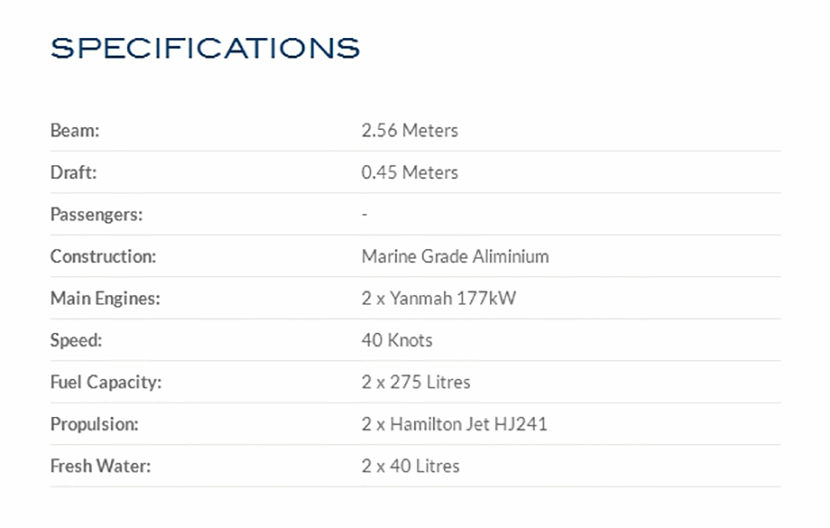 | 航速: | 40kn | 船體材料: | 鋁 |