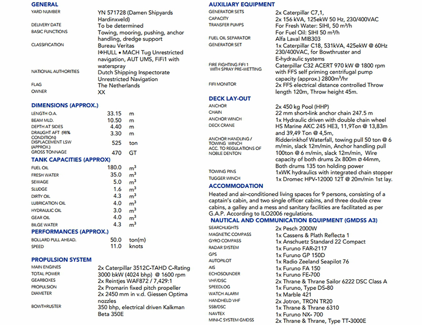 | 發(fā)電機(jī)組: | 2×Caterpilar 3512C-TAHD C-Rating | 齒輪箱: | 2×Reintjes WAF 872 |