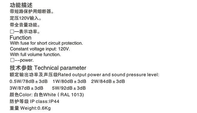 功率: 5W 聲壓等級: 92dB