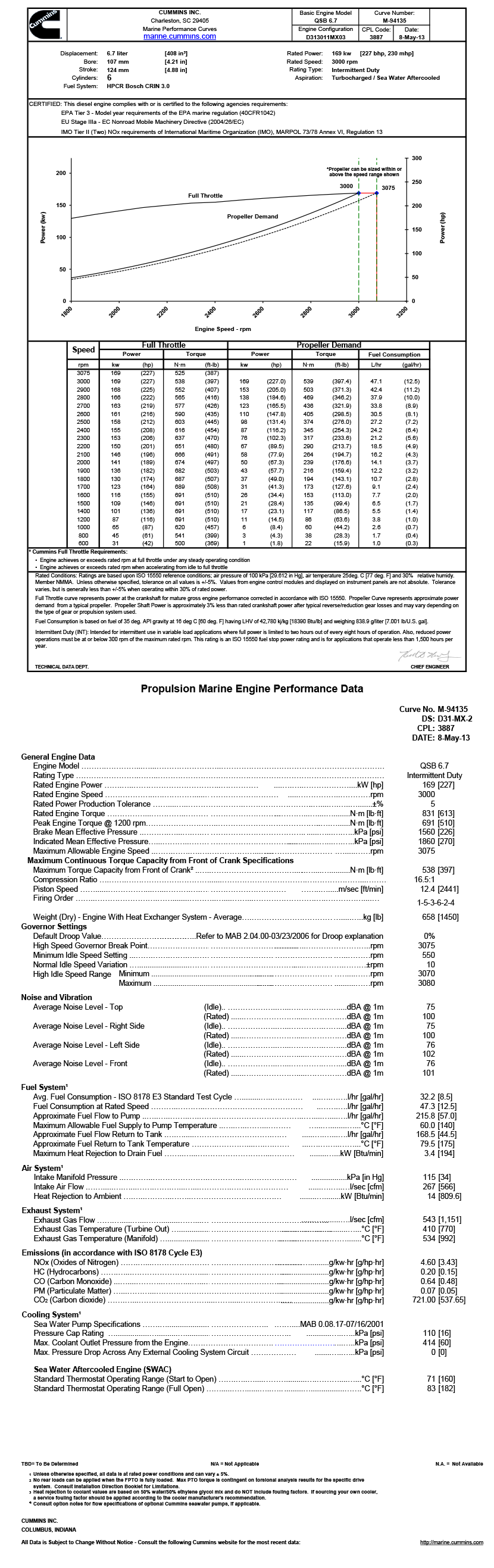 排放標(biāo)準(zhǔn): EPA Tier 3-Model year requirements of the EPA marine regulation(40CFR1042);EU Stage IIIa-EC Nonroad Mobile Machinery Directive(2004/26/EC);IMO Tier II(Two)NOx requirements of International Maritime Organization(IMO),MARPOL 73/78 Annex VI,Regulation 13
