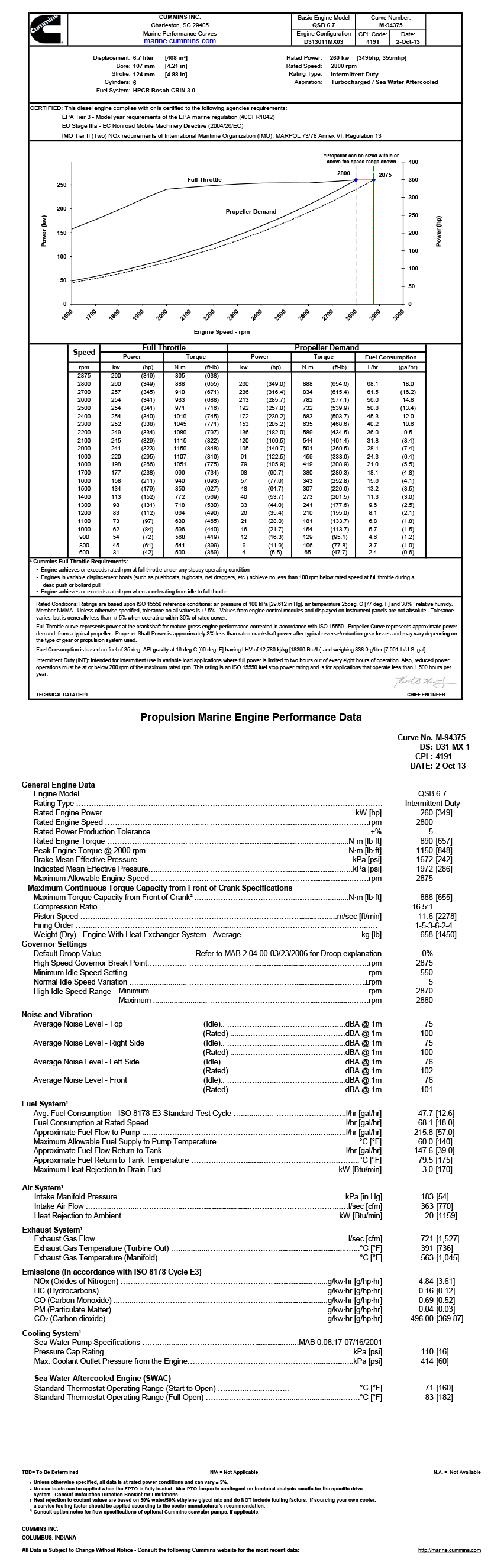 排放標準: EPA Tier 3-Model year requirements of the EPA marine regulation(40CFR1042);EU Stage IIIa-EC Nonroad Mobile Machinery Directive(2004/26/EC);IMO Tier II(Two)NOx requirements of International Maritime Organization(IMO),MARPOL 73/78 Annex VI,Regulation 13