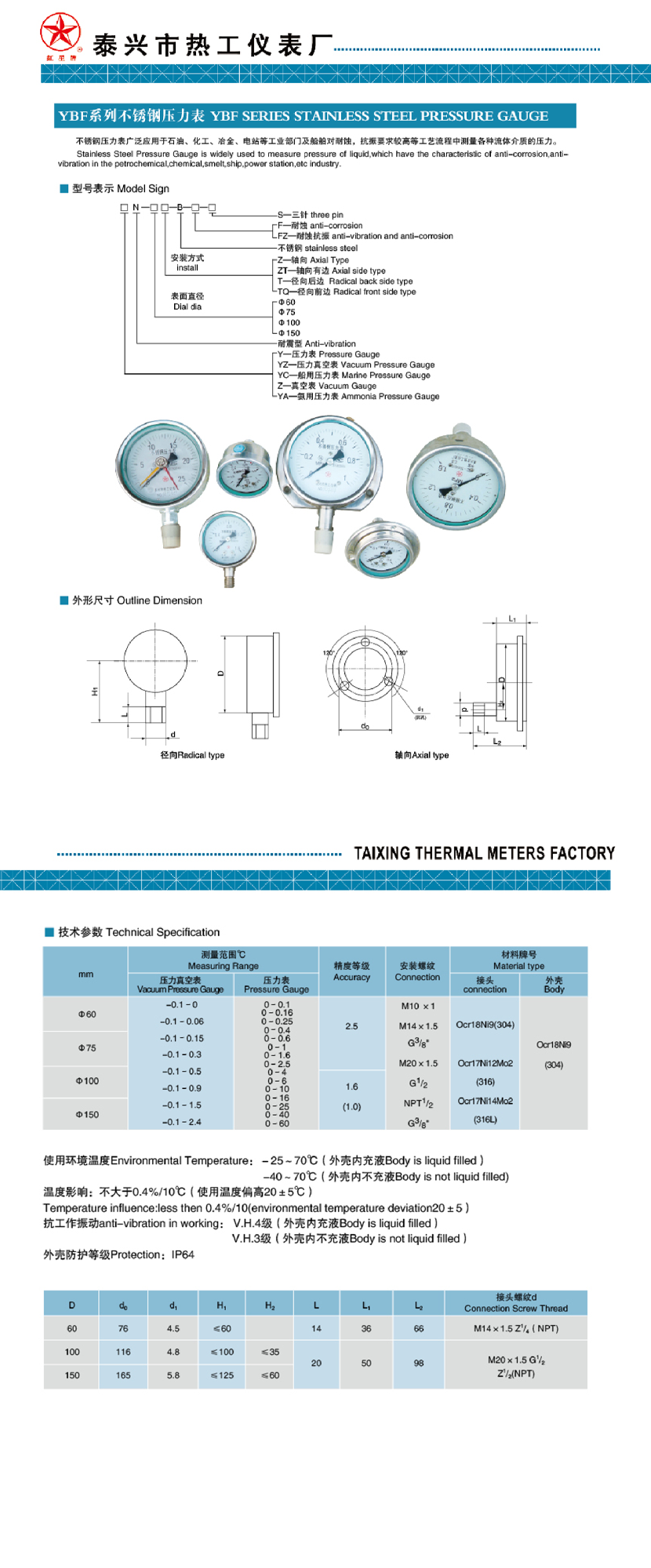 環(huán)境溫度: -25~70(外殼內(nèi)充液)/-40~70(外殼內(nèi)不充液)℃ 防護等級: IP64
