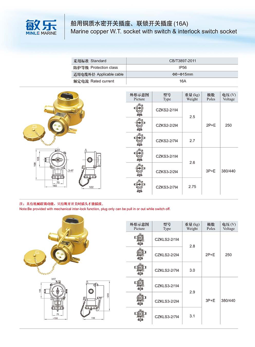 | 船用銅質水密聯鎖開關插座(16A) | |||