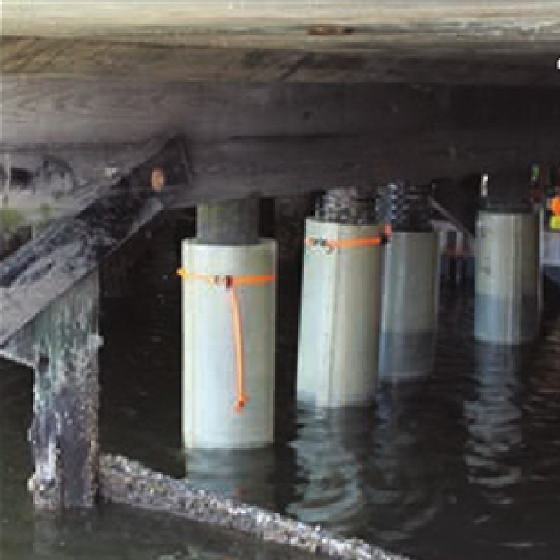 其他優勢: Can significantly increase the strength of the original timber pile; Non-corrosive reinforcement; Reduced weight when compared to steel reinforced repairs; Lightweight and easy to install; Requires inexpensive pumping equipment; Optimum maintenance free service life; Translucent GRP Forms enable internal grout level to be easily monitored; Environmentally friendly