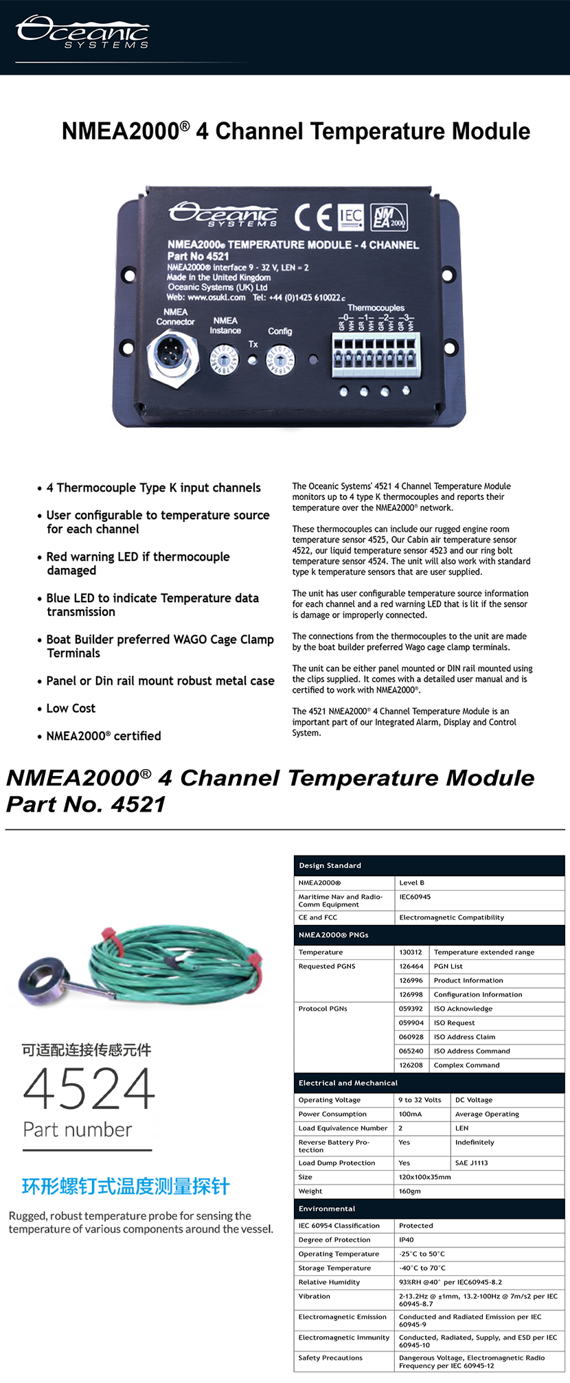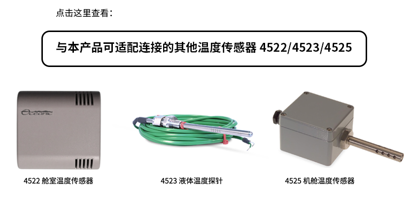 供應范圍: 需另配溫度傳感元件 建議搭配: 環形螺釘式溫度測量探針4524/艙室溫度傳感器4522/液體溫度探針4523/機艙溫度傳感器4525
