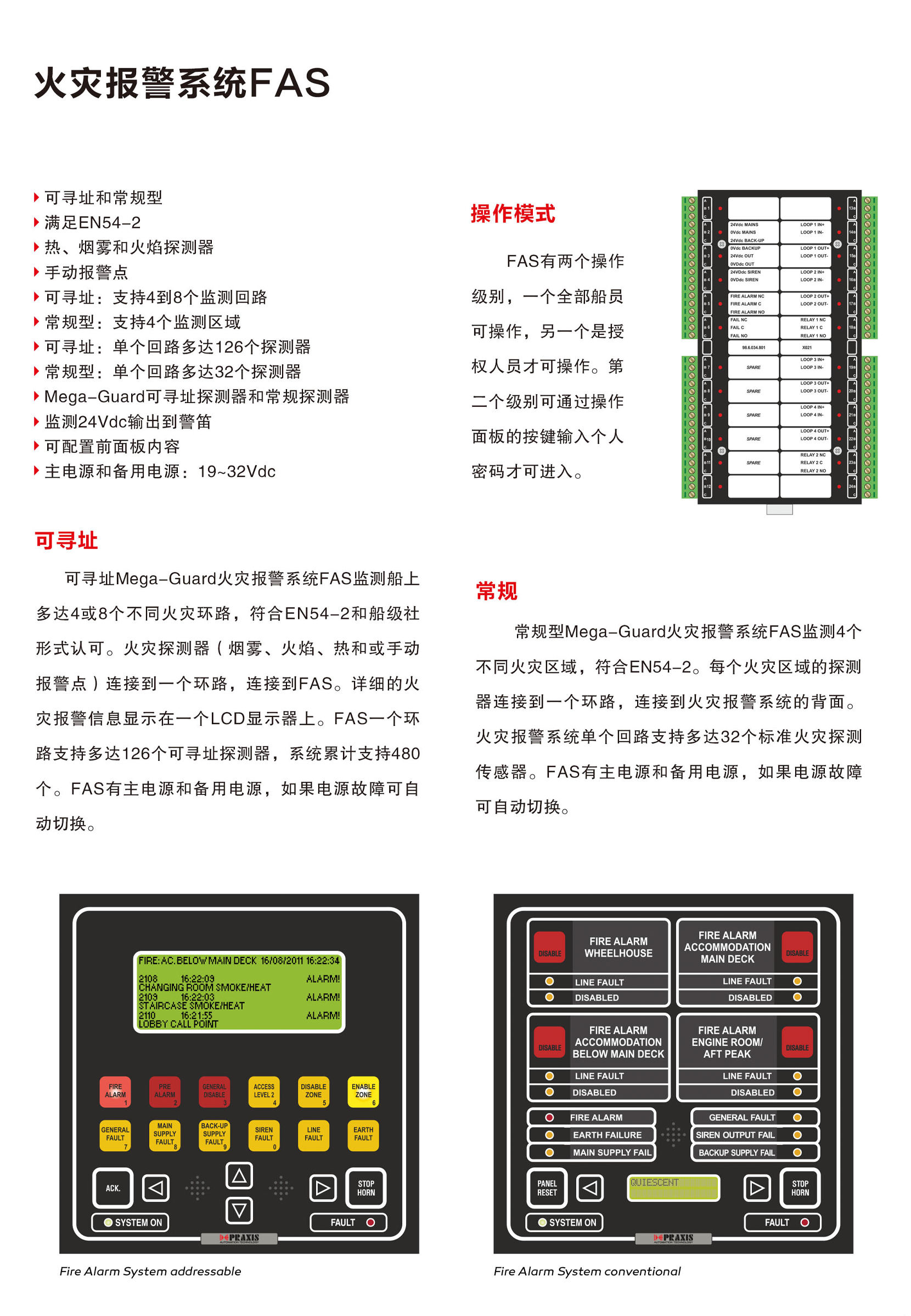 | 系統(tǒng)特點(diǎn): | 可尋址型系統(tǒng)可監(jiān)測船上多達(dá)4或8個不同的火災(zāi)環(huán)路;有主電源和備用電源,如果電源故障可自動切換;分權(quán)限級別操作模式 | ||